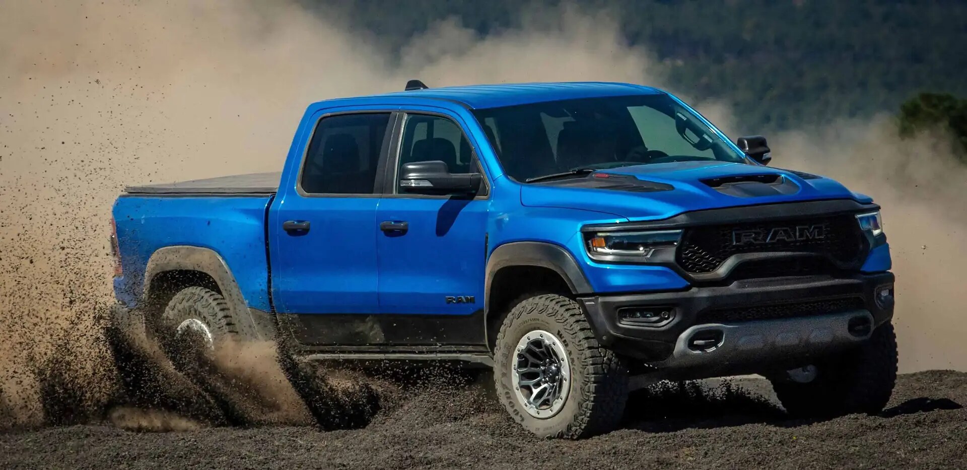 This unmistakable new RAM truck boasts an eye-catching and rugged design. Its 35-inch tires show it is made for off road adventuring. This unique model also comes with a TRX functional hood scoop, a high-performance air induction system that carries 32.9 liters of air per minute to the HEMI® engine, and available accessories like the bed-mounted spare tire carrier and RamBar.